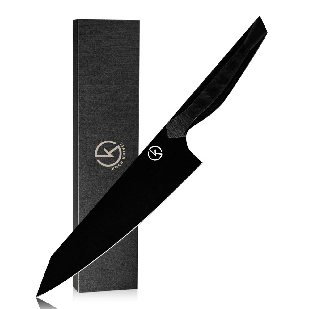 The Koch NightFox 8" Kiritsuke Culinary Utensil is designed for multi-purpose kitchen tasks, including slicing, dicing, and cutting vegetables with ease. Its straight, the long tool allows precise work for delicate ingredients as well as larger, intricate cuts.
