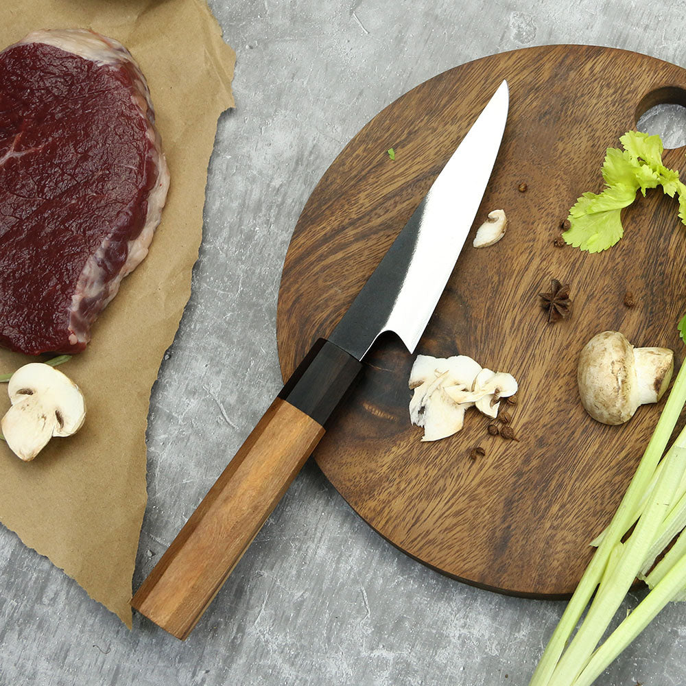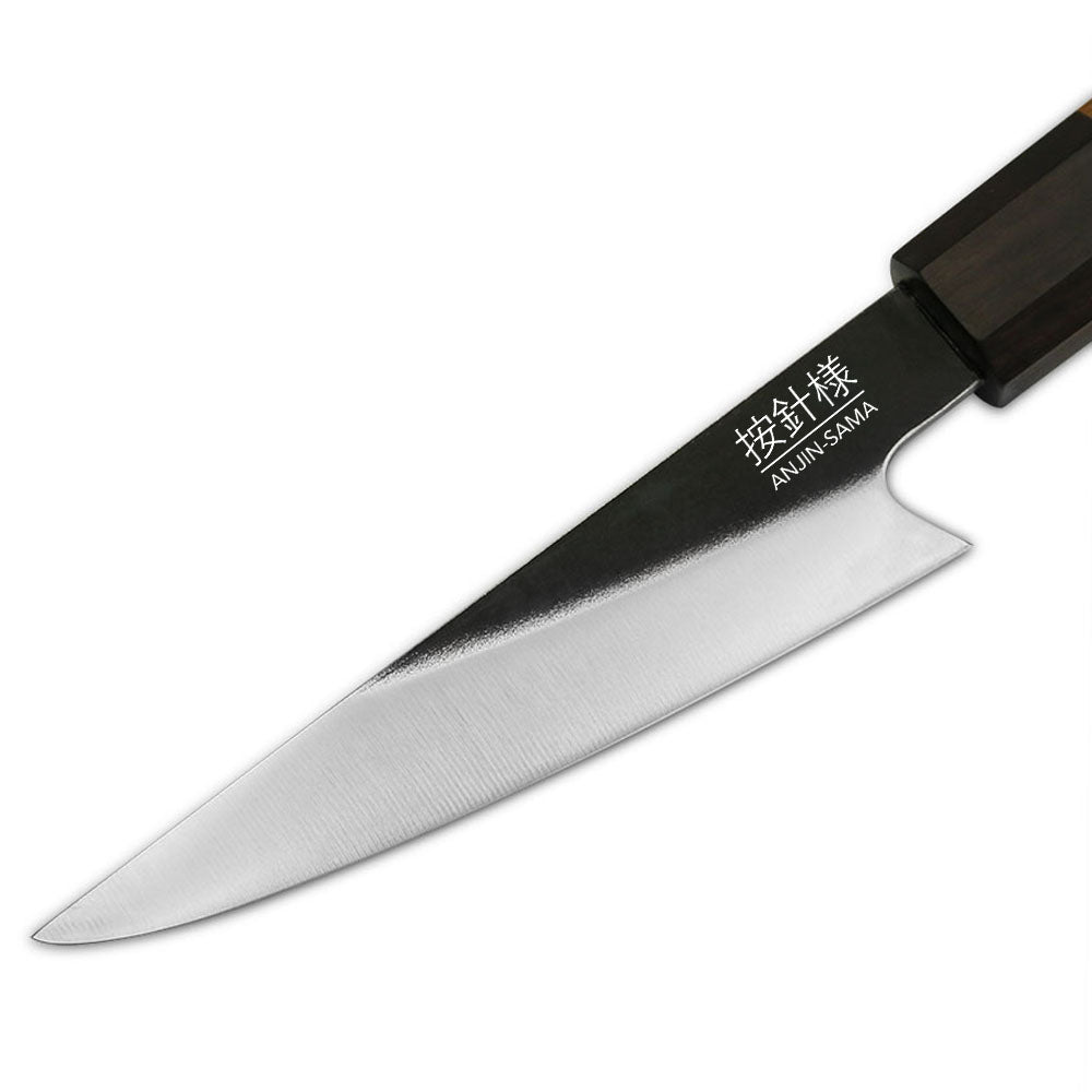 The ANJIN-SAMA Petty Culinary Utensil is designed for precision tasks in any kitchen. Ideal for decorative cuts, peeling, and intricate work, it handles vegetables, fruit, and detailed tasks like shaping fruit or removing potato sprouts. Crafted with a 143 mm 440C stainless steel culinary utensil featuring a Kurouchi finish, it combines durability with sharpness, while the olive wood handle provides a comfortable grip for controlled, delicate cuts. Suitable for both professional and home use, this utensil offers versatility and finesse.