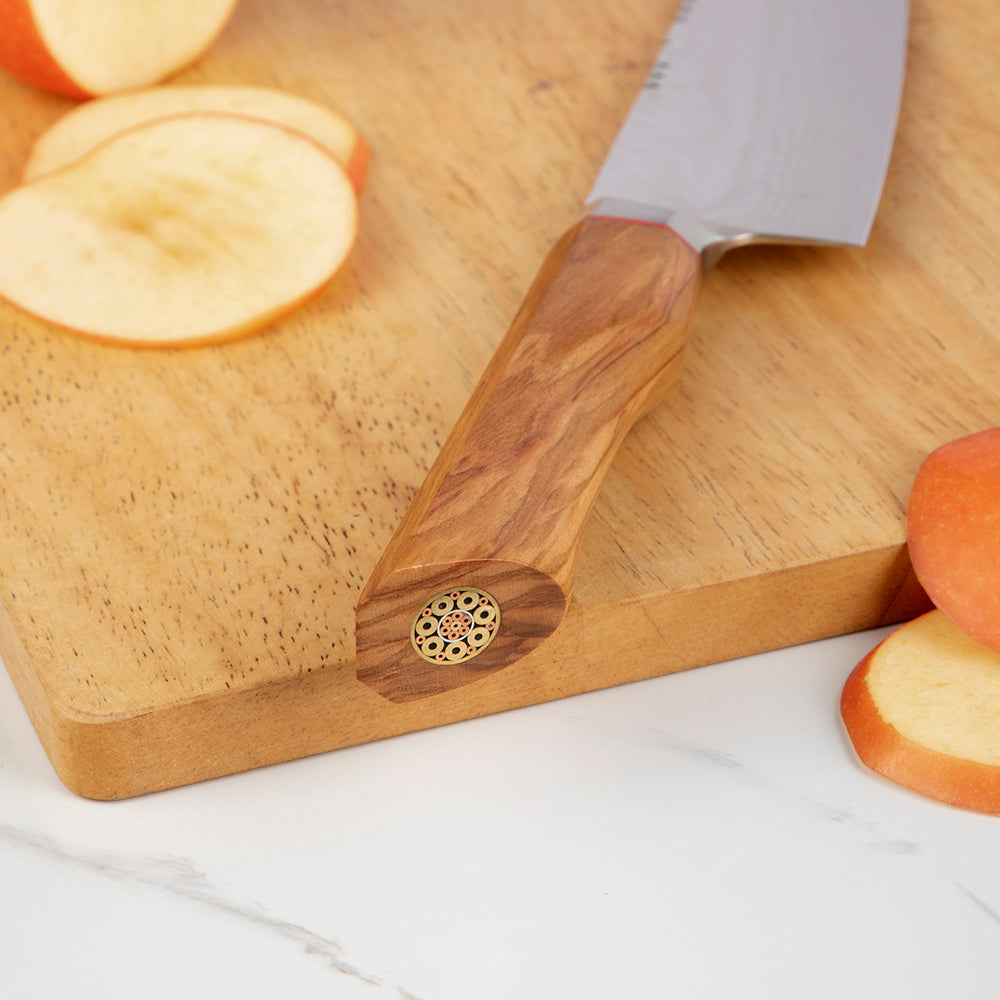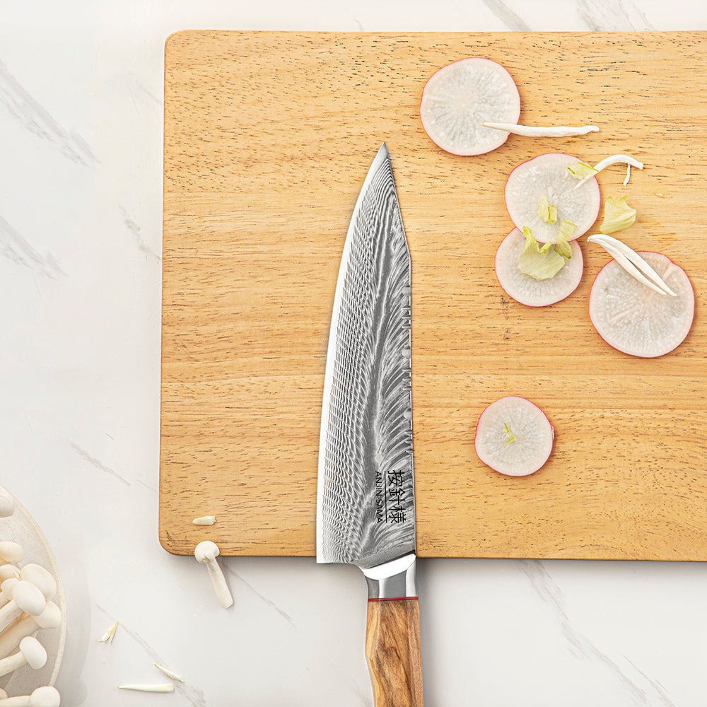 Each Anjin-Sama showcases a unique and naturally formed Damascus pattern, with meticulous polishing and sharpening by master craftsmen. Paired with an ergonomic olive wood handle, this brings elegance and performance to any culinary setting.