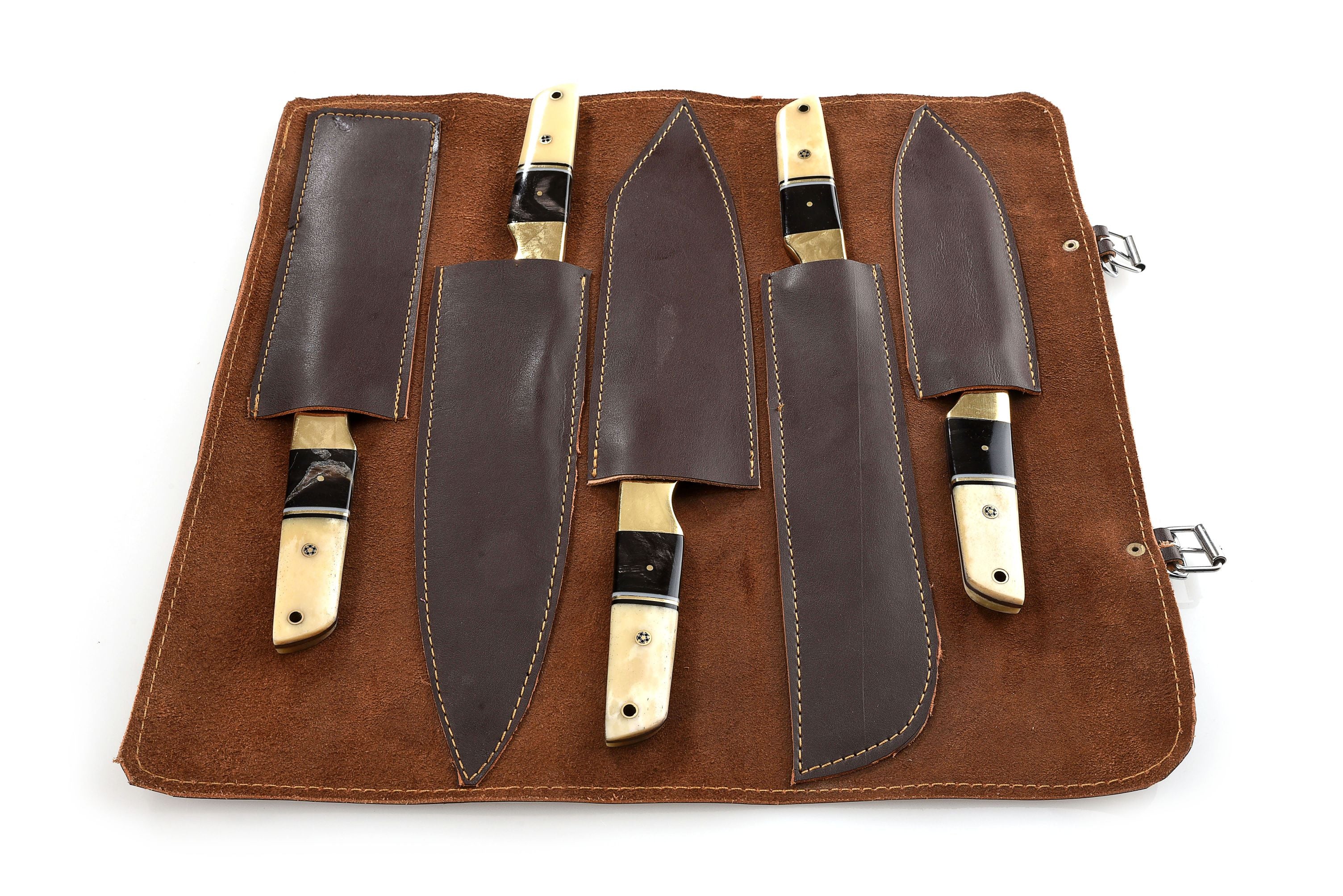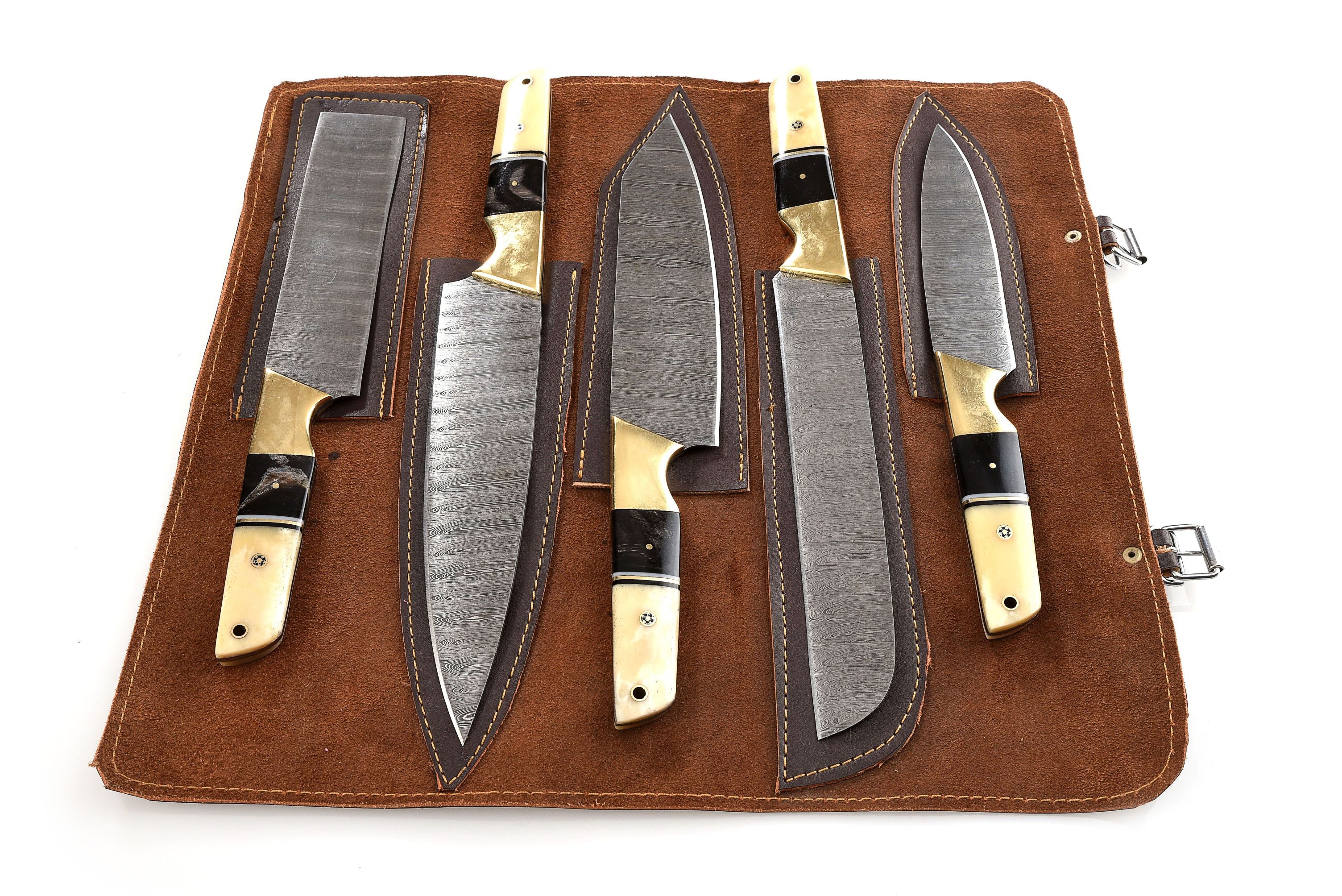Introducing the Koch 5 Piece Handmade Damascus Chef Set - Bull Horn and Camel Bone, a high-quality collection of handmade for the discerning chef. This roll comes equipped with five Handmade Gourmet Damascus Steel Utensils, each with its own unique purpose and crafted from the finest materials.