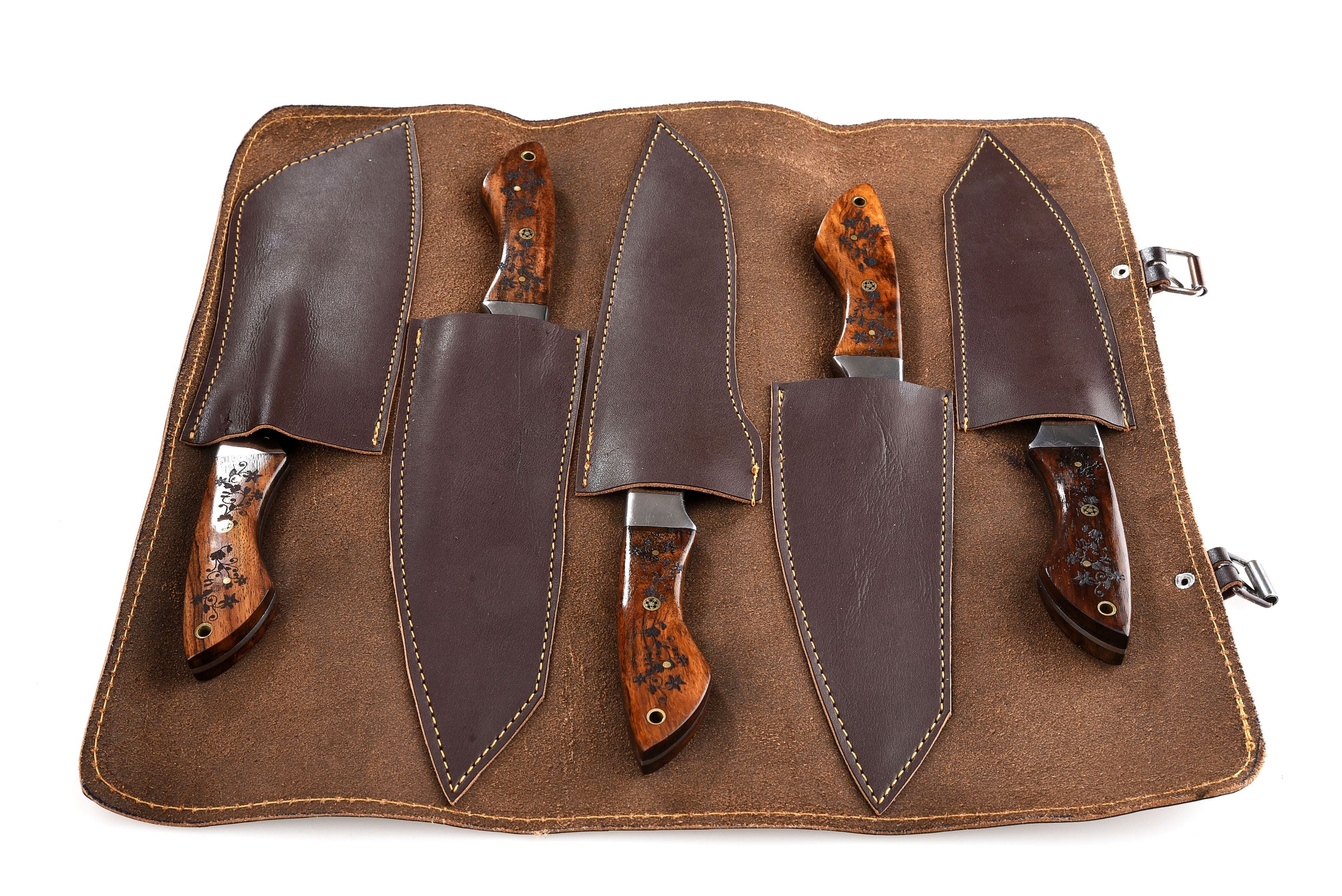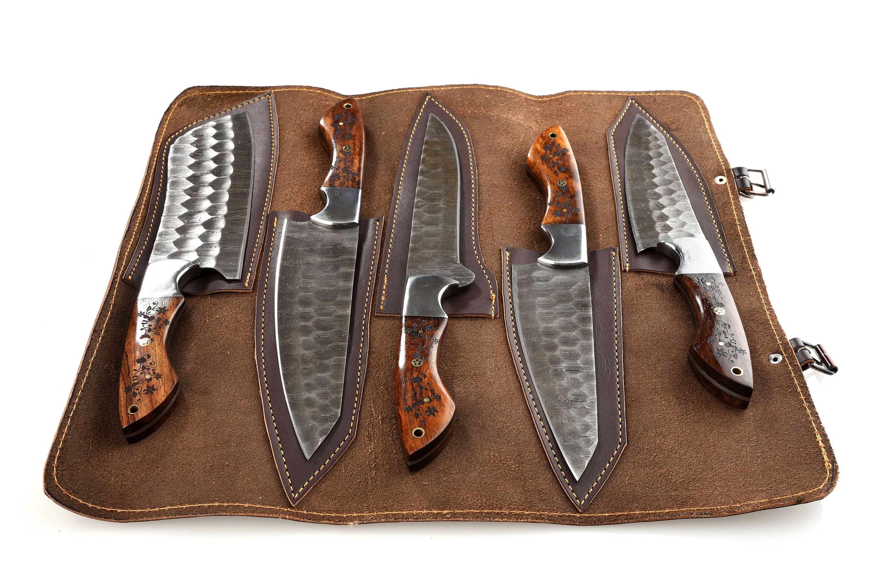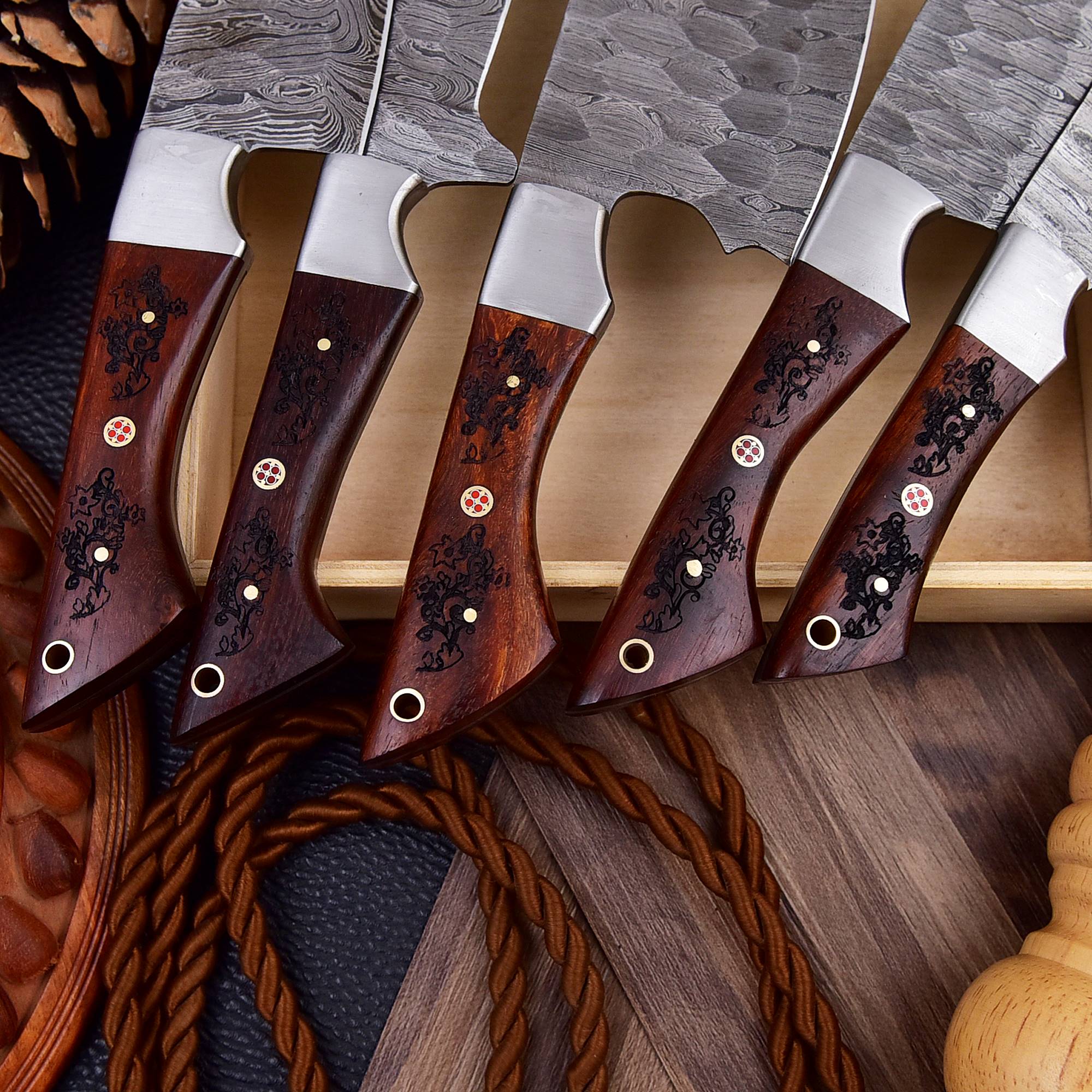 Introducing the Koch CR-WG5, a 5-piece handmade Damascus chef set with engraved wood handles. This set includes a carving , chef's , cleaver, paring , and utility , all housed in a hand-stitched leather roll for easy storage and transport.