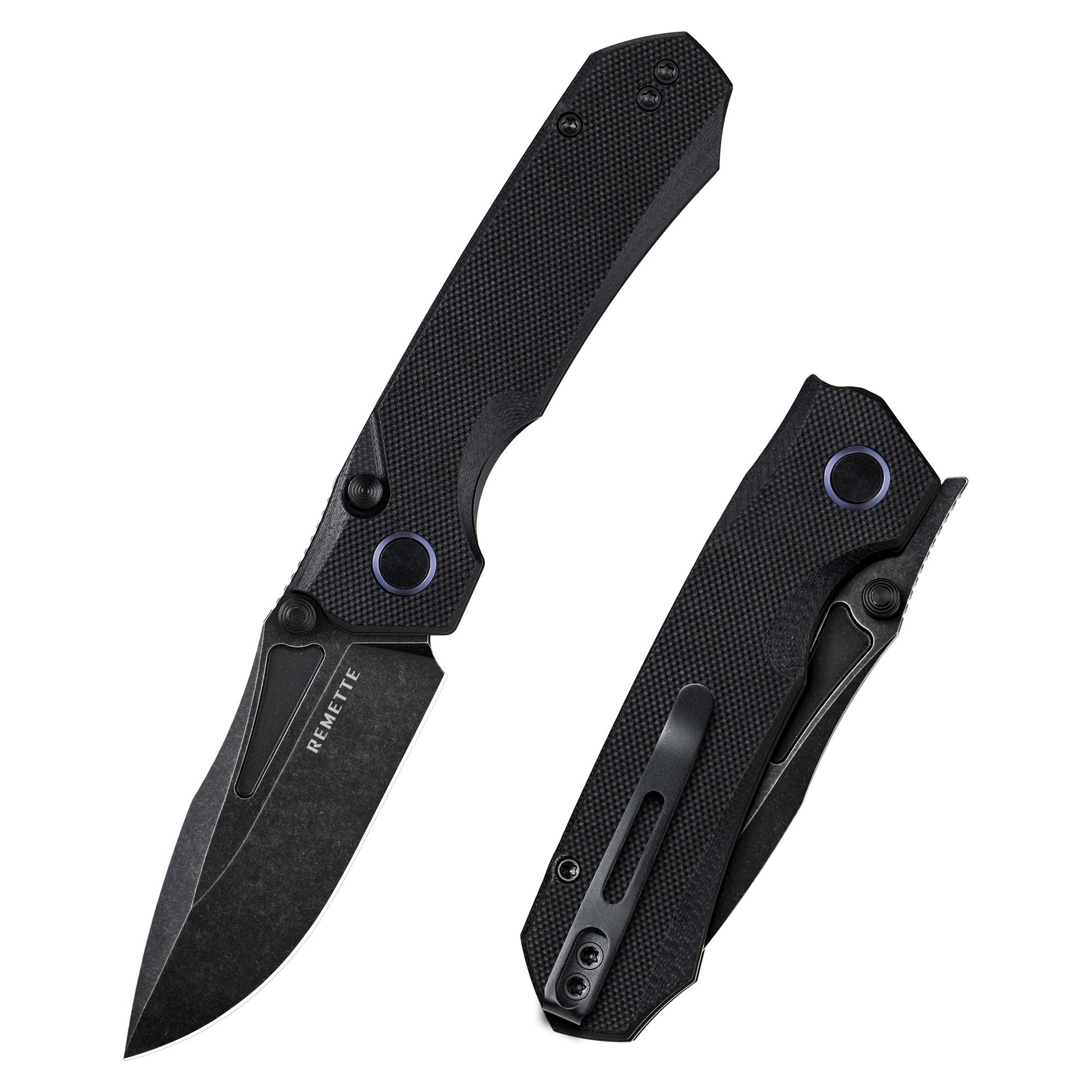 The Remette RNDG1 Rhino is a compact utility tool designed for everyday tasks at home, on the job, or in the workshop. D2 steel with a titanium-coated finish supports consistent performance and wear resistance. A textured G10 grip offers steady handling in varied conditions. A smooth, manual pivot mechanism provides reliable operation, and the uniform black finish delivers a clean, understated look.