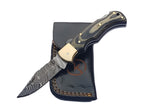 The Handmade Damascus Steel Folder - Pakkawood SCZ-952B is a finely crafted folding tool featuring a carbon Damascus utility, delivering sharpness, edge retention, and a unique pattern that makes each piece one of a kind. With a 75mm wetstone-sharpened utility and a 95mm pakkawood handle accented by brass bolsters, this 170mm folder offers a perfect blend of durability and elegance. The flat grind ensures precision cutting, while the included leather sheath provides secure storage.