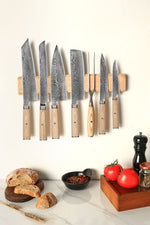 Premium magnetic wall storage for culinary utensils. The 40 cm Koch bar uses powerful neodymium magnets embedded across the length to hold items evenly and securely—keeping your most-used tools visible and within easy reach while freeing up counter space.