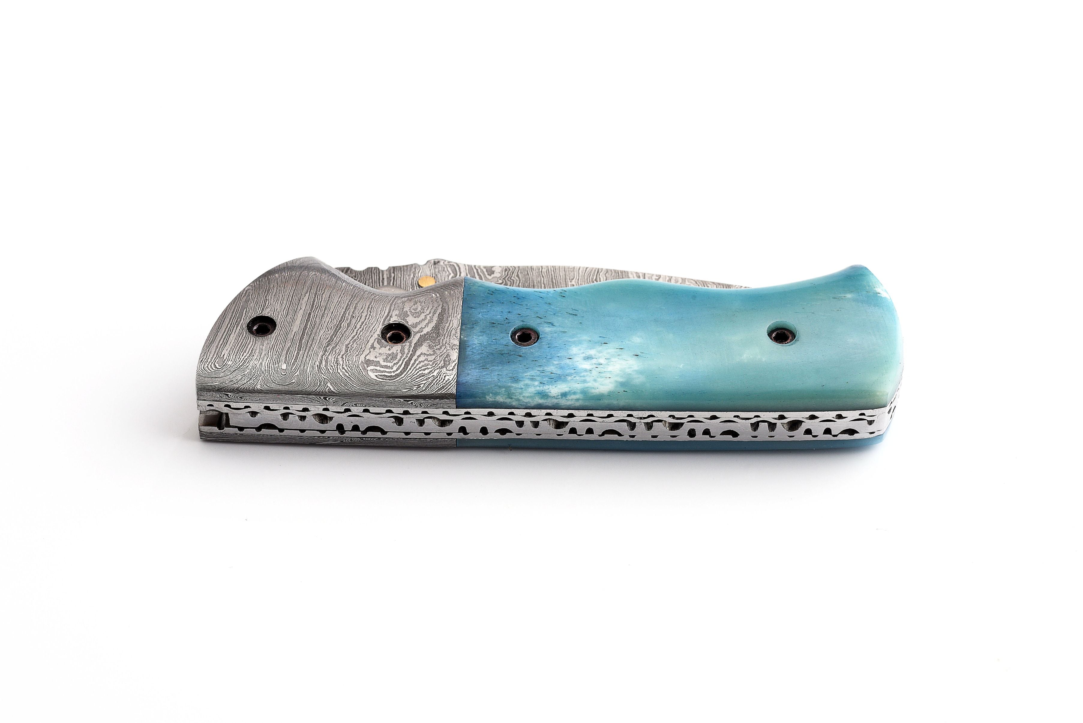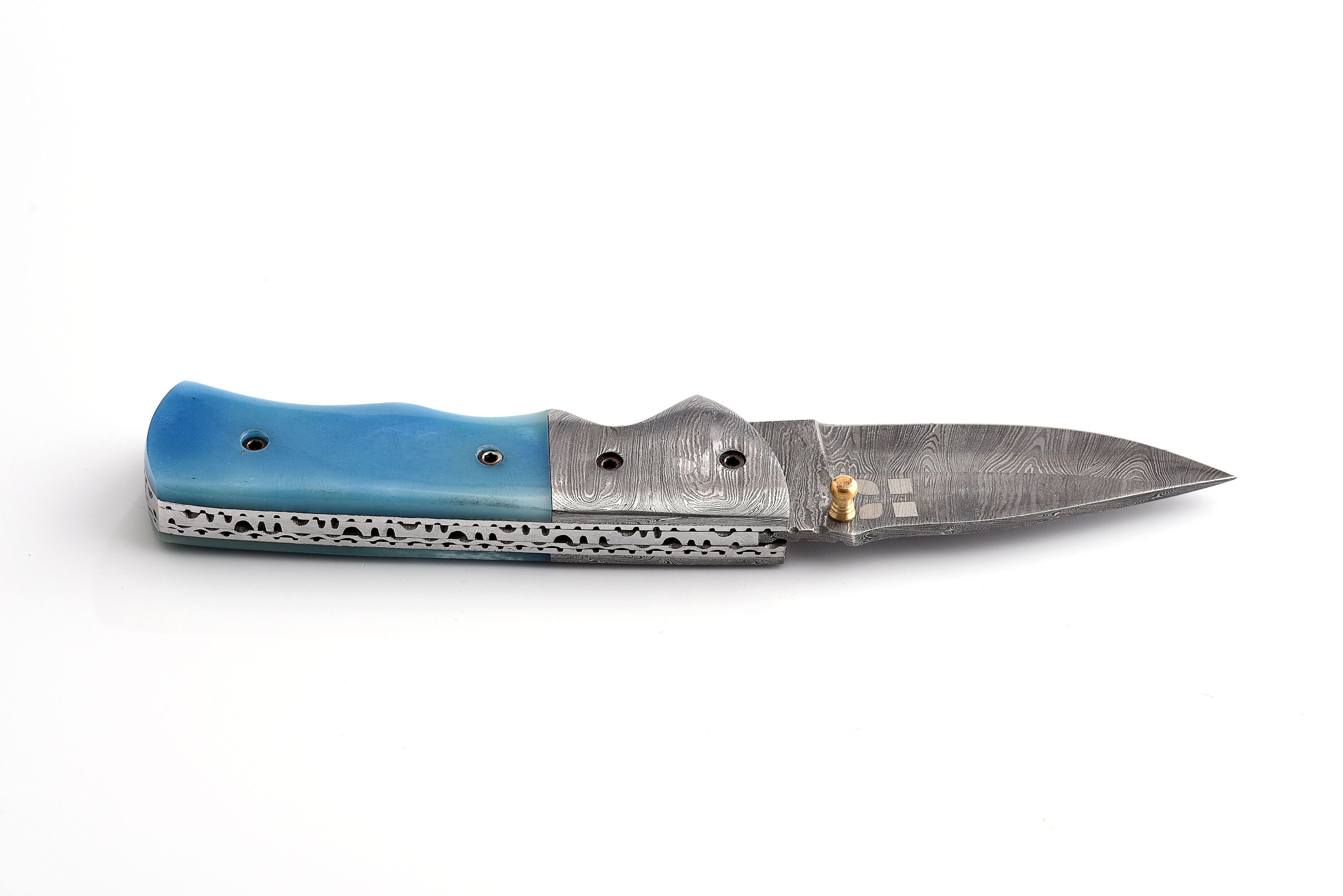 A handcrafted Damascus liner-lock folding utility tool designed for confident, controlled everyday tasks. The layered Damascus working edge (approx. 256 layers) provides distinctive patterning and dependable performance, while the tinted camel-bone handle offers a secure, comfortable hold. A matching Damascus guard and a leather sheath complete the set. A thoughtful gift for the outdoor enthusiast.