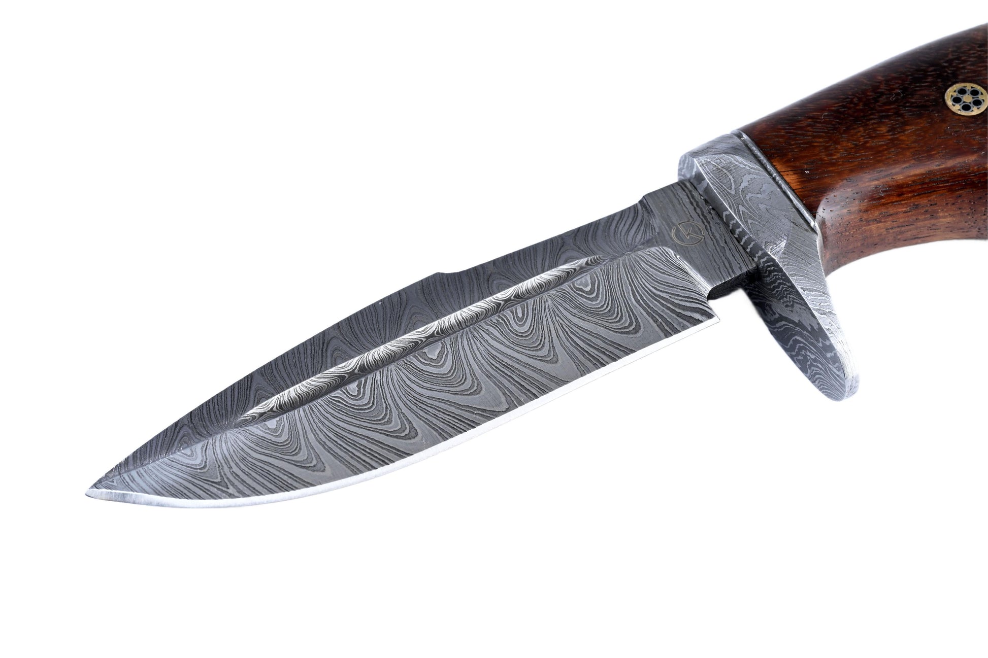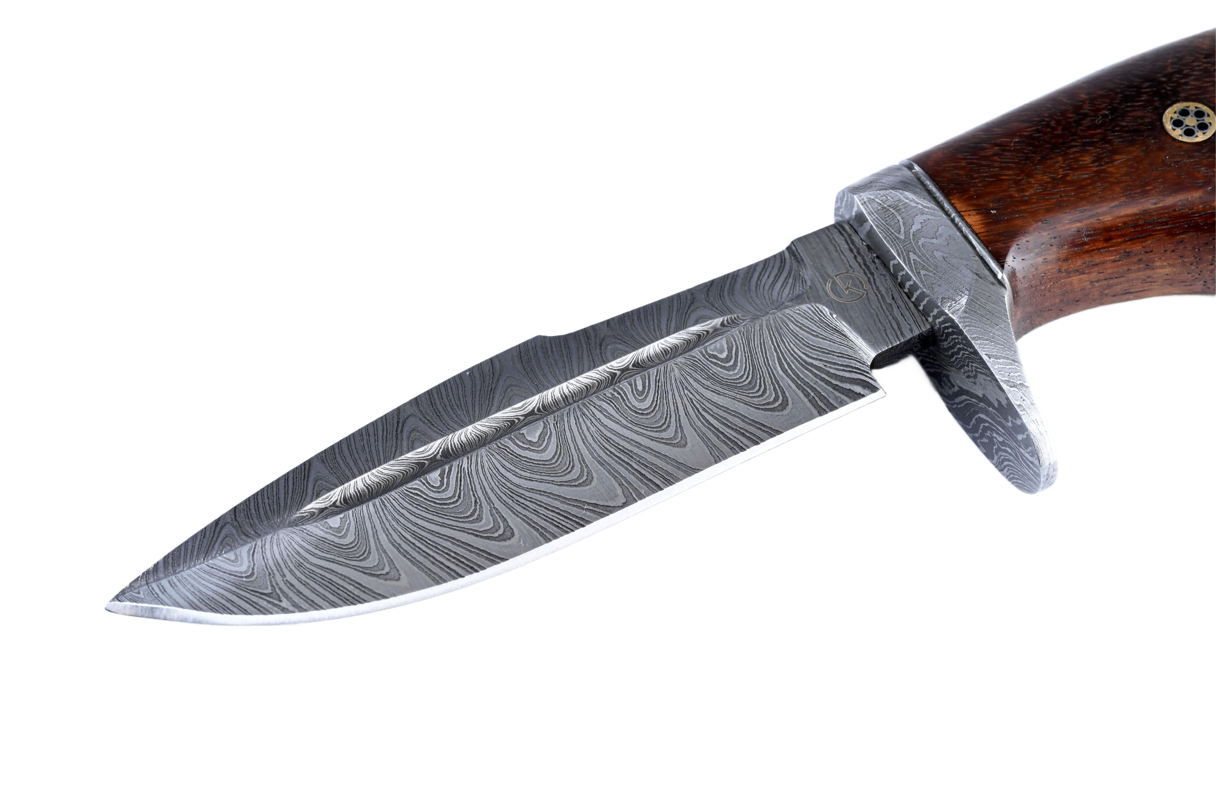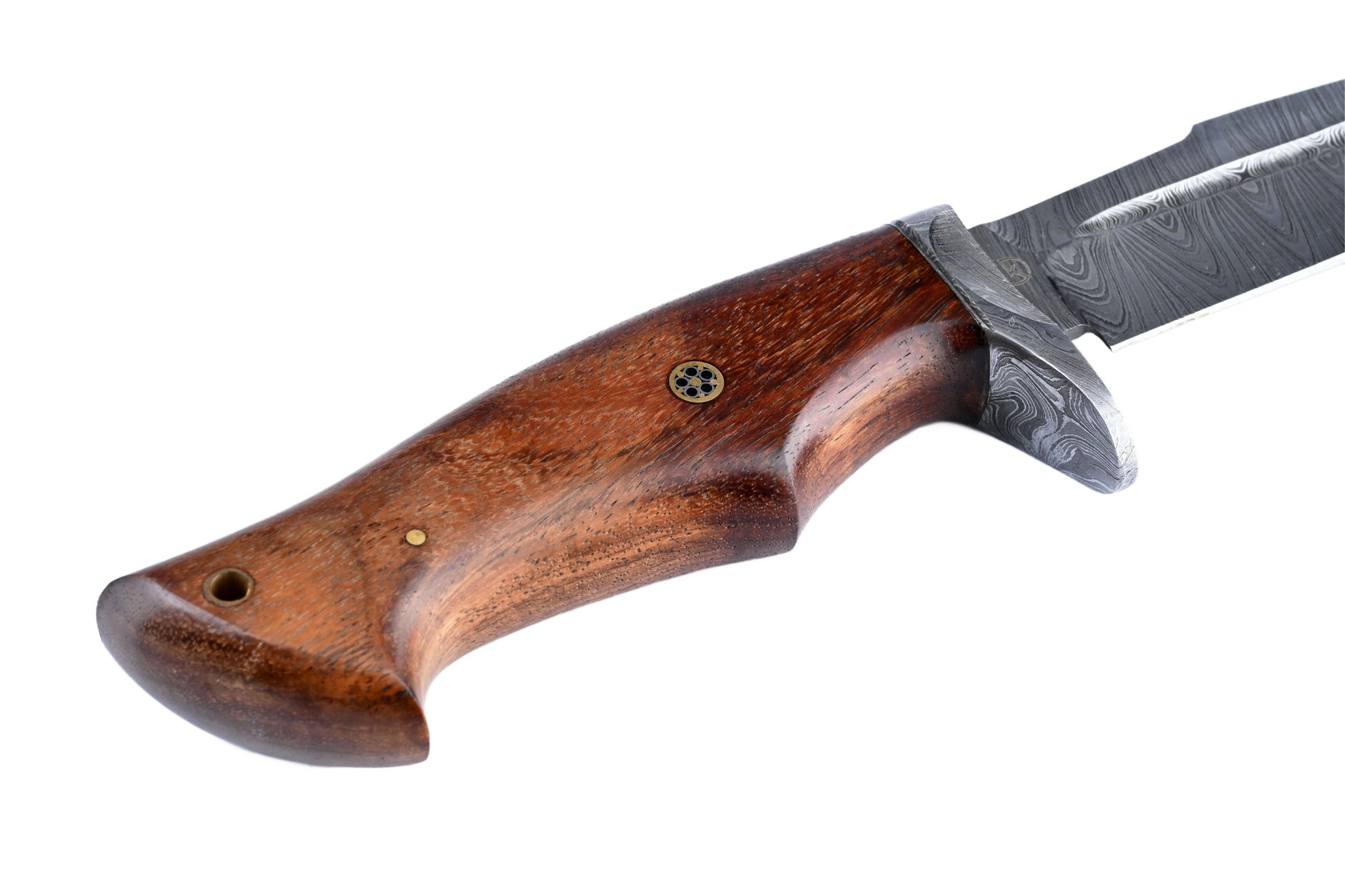 A handcrafted twisted-pattern Damascus outdoor utility tool built for controlled, confident use. The contoured hardwood handle provides a secure, comfortable grip, while the patterned guard and mosaic-pin detail add a refined finish. Supplied with a stitched leather sheath for protection and easy carry.