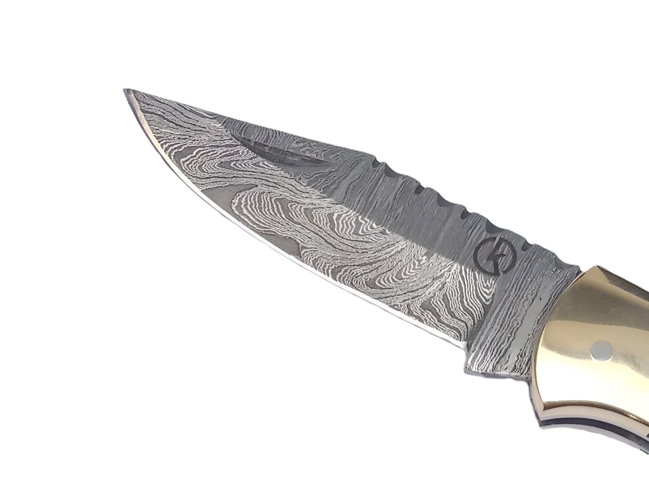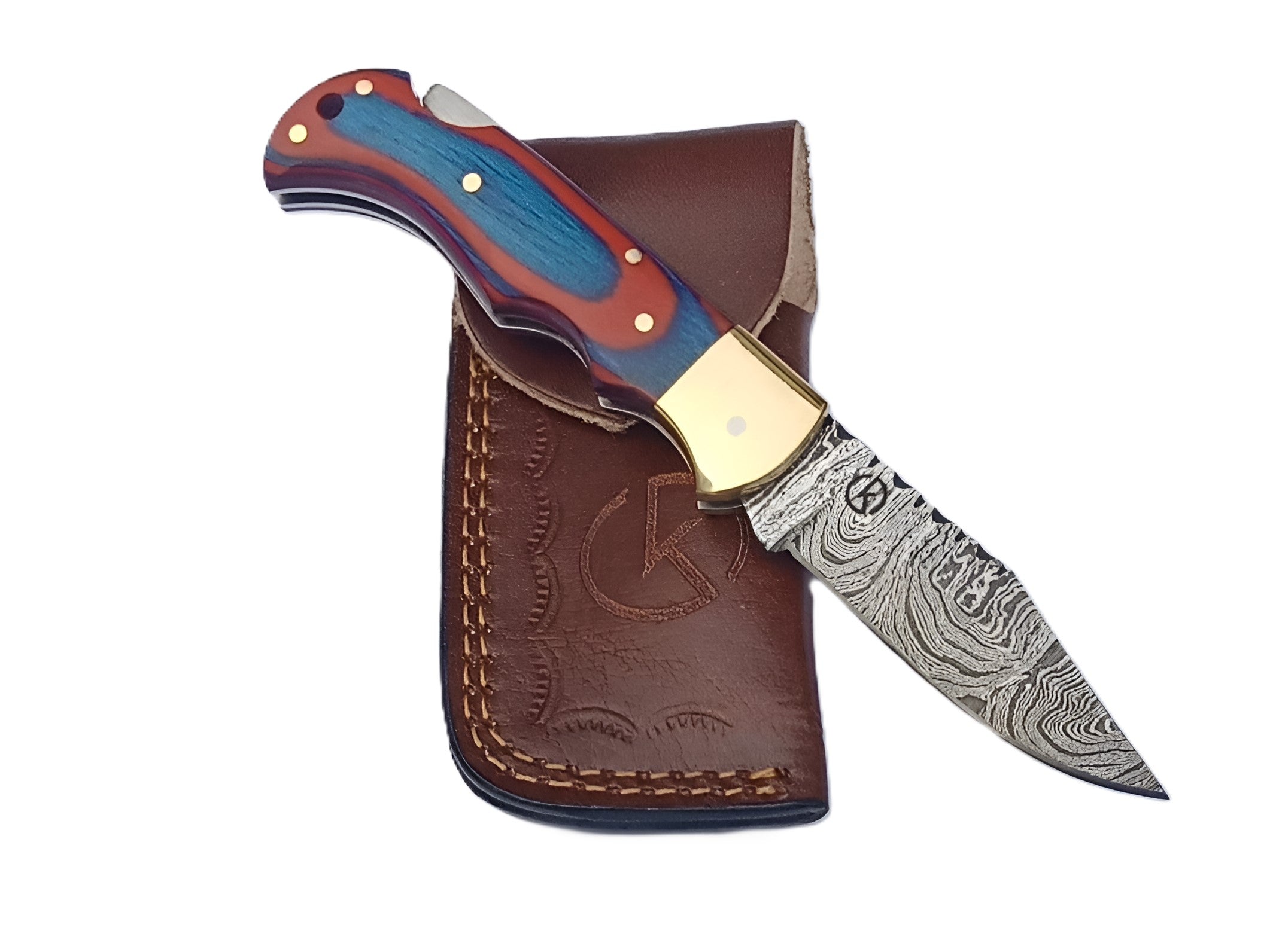 The Handmade Damascus Steel Folder - Pakkawood SCZ-952C is a finely crafted folding tool featuring a carbon Damascus utility, delivering sharpness, edge retention, and a unique pattern that makes each piece one of a kind. With a 75mm wetstone-sharpened utility and a 95mm pakkawood handle accented by brass bolsters, this 170mm folder offers a perfect blend of durability and reliable performance. The flat grind ensures precision cutting, while the included leather sheath provides secure storage.