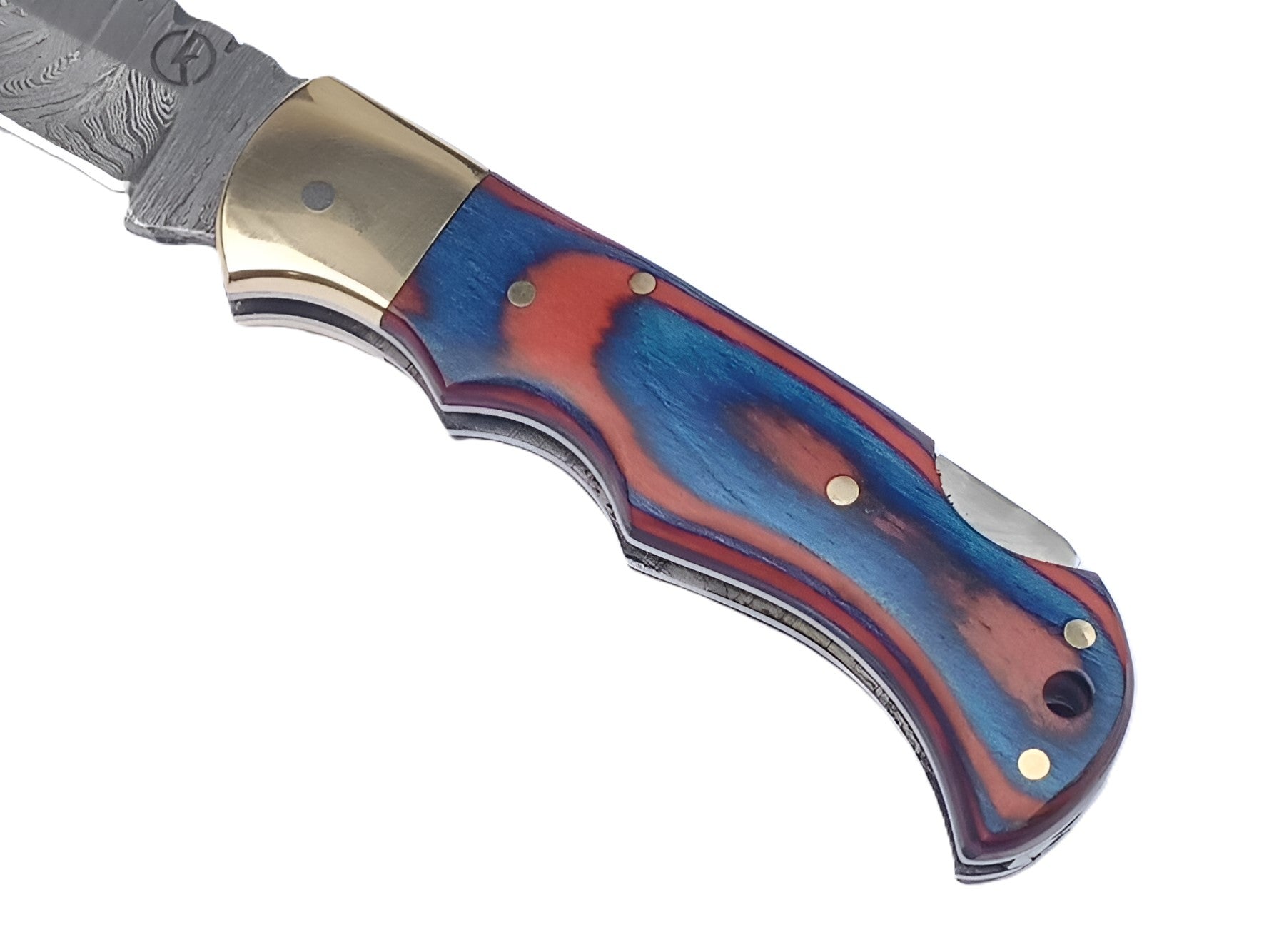 Elegant Damascus folding tool with pakkawood details, designed for smooth operation.