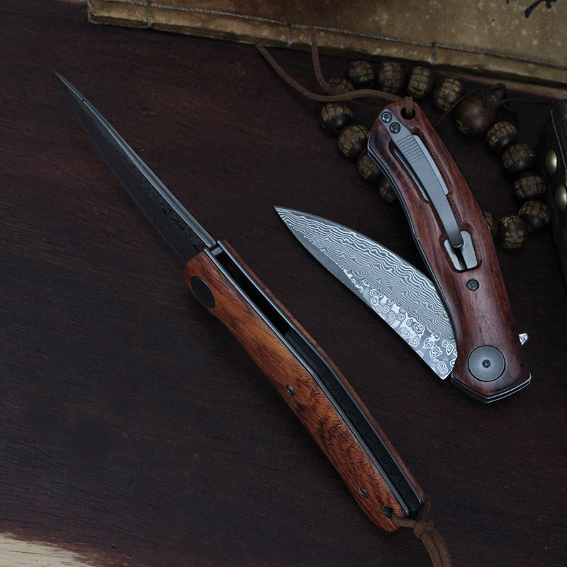 A folding daily-use tool made with stainless Damascus steel. Designed for reliable performance and a distinctive look.