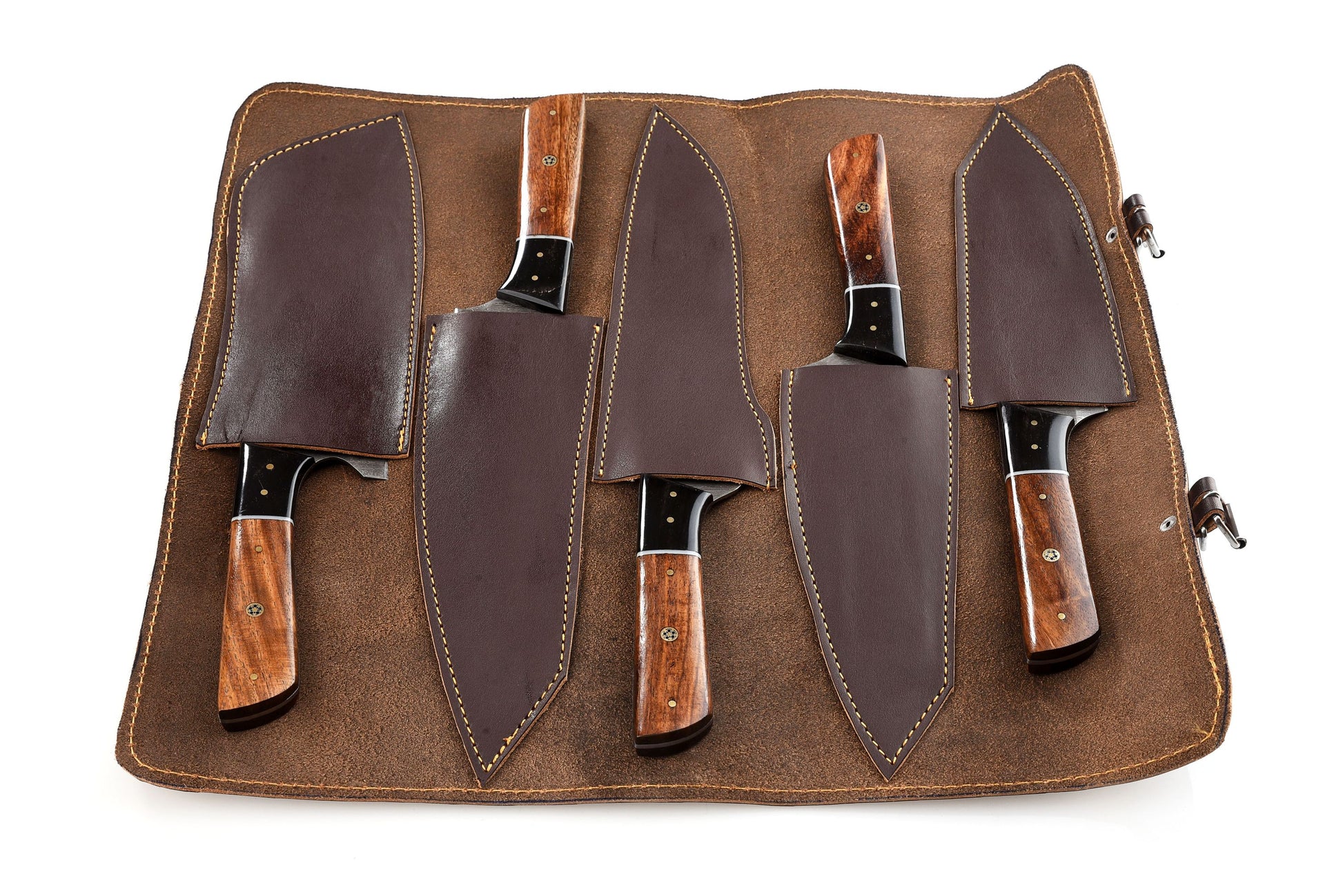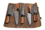Introducing the Koch CR-W5: a 5-piece handmade Damascus culinary set with engraved wood handles and micarta bolsters. The set includes a carving utensil, chef’s utensil, cleaver, paring utensil, and utility utensil, neatly stored in a hand-stitched leather roll for easy transport and protection.
