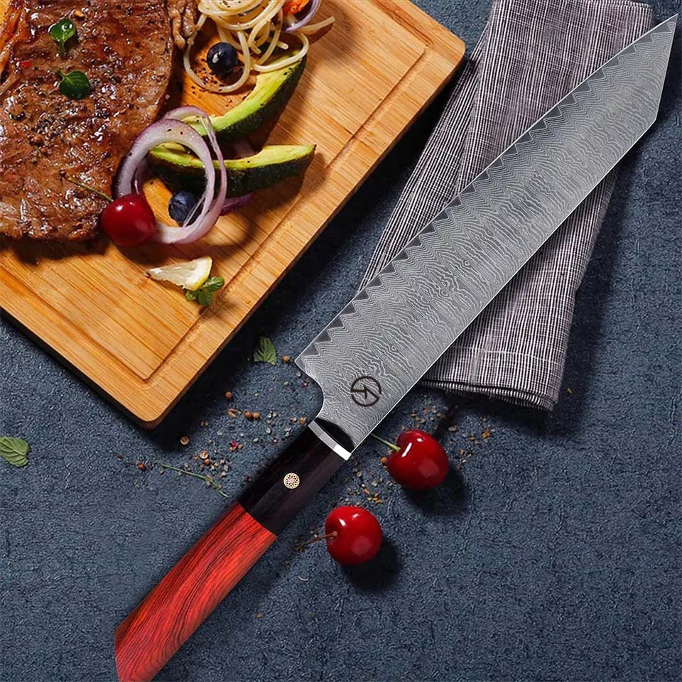 High-density stainless steel layering: Crafted with high-density stainless steel layering and high-carbon steel construction, our is exceptionally strong and razor-sharp. It's built to withstand the rigors of your kitchen and maintain its edge, cut after cut.