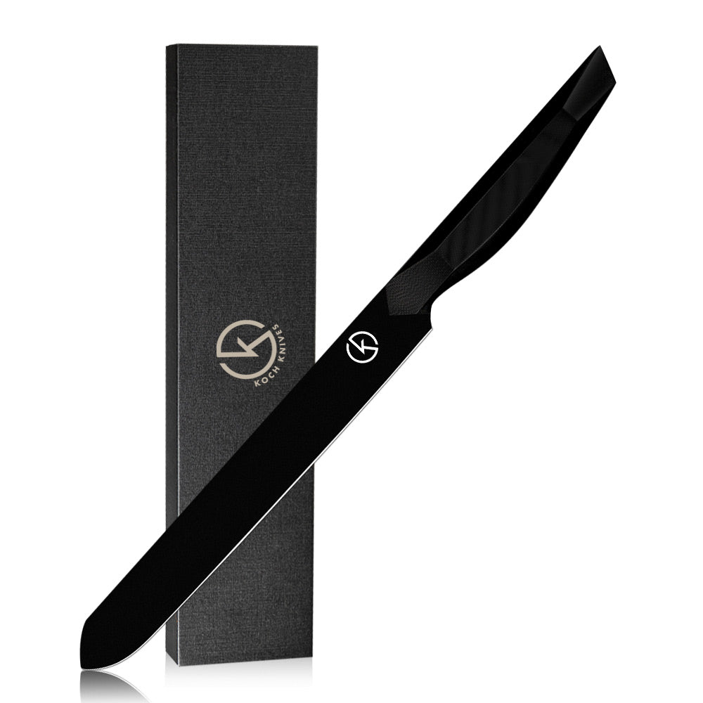 Perfect for slicing thin, even pieces of meat, the Koch NightFox 8" Slicing Culinary Utensil is suitable for roast beef, salmon, and other meats. Its slim tool and balanced design make it a reliable choice for both professional and home kitchens.
